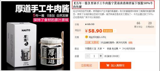 你看第一张图,是常规的牛肉酱,一般情况下,那就大价格战吧,差不多十几块钱一瓶,一般都会三瓶、四瓶、甚至十几瓶这样去卖,这就属于没有溢价元素的。
