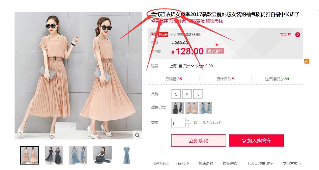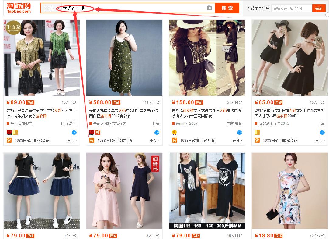 而如果我们的产品更倾向于大码连衣裙, 因为我们的产品模特是比较胖的, 那很明显我们针对人群就是喜欢穿大码的, 所以我们如果用大码连衣裙作为精准的核心词来组合标题, 那我们的产品就有更多的机会展现在搜索大码连衣裙的人群面前, 而在这个人群面前你在搜索雪纺连衣裙的人群面前点击率更加的大, 你就是这个人群,更加适合我们的产品, 而我们的产品也就更加容易获得流量, 就更加容易获得订单, 我们产品在这样的人群面前就更加容易的得到数据和权重的提升。