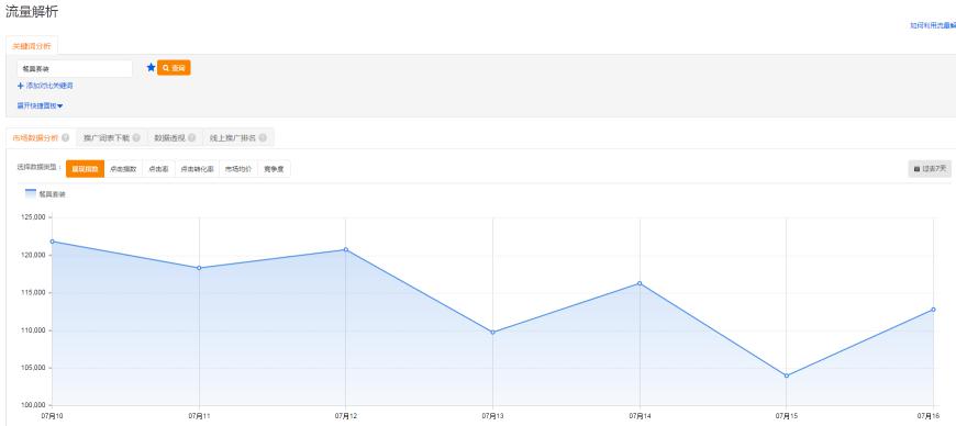 这里我并没有马上说维护,因为我们需要看这个词在行业里面是否发生下滑了。这样好判断需不需要维护。比如餐具套装这个词下滑了,我们可以通过生意参谋市场行情去看是否出现搜索人气降低。如果没有生意参谋也不要紧,我们用直通车的流量解析去查这个词的展现情况怎么样。