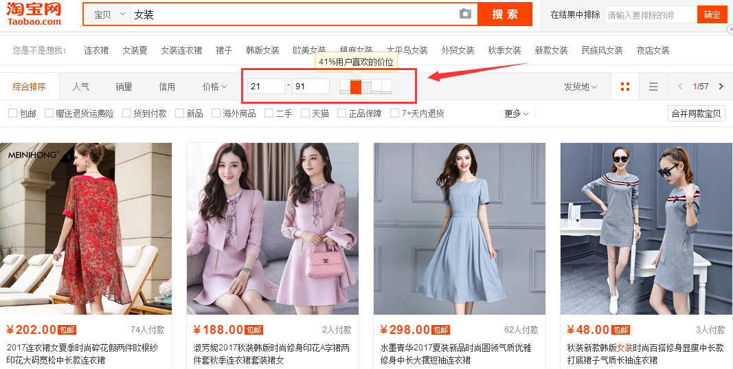 这里我还是用女装为例子,筛选后的价格带是这样:10%的买家喜爱0—21元的;41%的买家喜爱21—91元的;36%的买家喜爱91—205元的;8%的买家喜爱205—365元的;5%的买家喜爱365元以上的。这个就是官方系统给出来的一个数据,搜索关键词后,首页就会显示的。而你属于哪个区间的价格就去进行筛选一下价格带,这样就可以帮你筛选掉很多的竞争对手了。